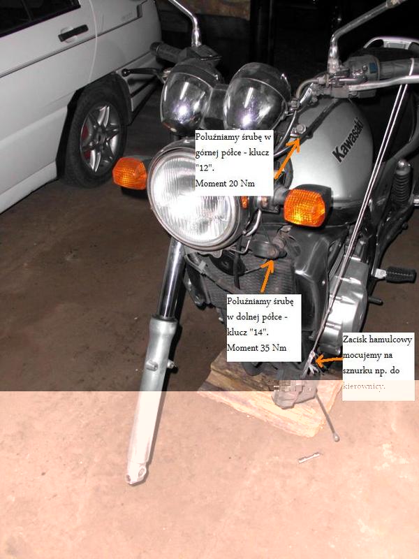 1. Należy ustawić motocykl tak, aby przednie koło było w powietrzu - ja wrzucam bieg i podkładam drewniany klocek pod kolektory wydechowe. 2. Odkręcamy linkę szybkościomierza, a następnie zacisk hamulcowy i koło - wg. mnie kolejność bez znaczenia. Powiedzmy, ze zaczynamy od zacisku (kolejność zgodnie z cyferkami): (Zacisk mocujemy za pomocą sznurka do ramy, lub kierownicy, żeby nie "dyndał" na przewodzie).