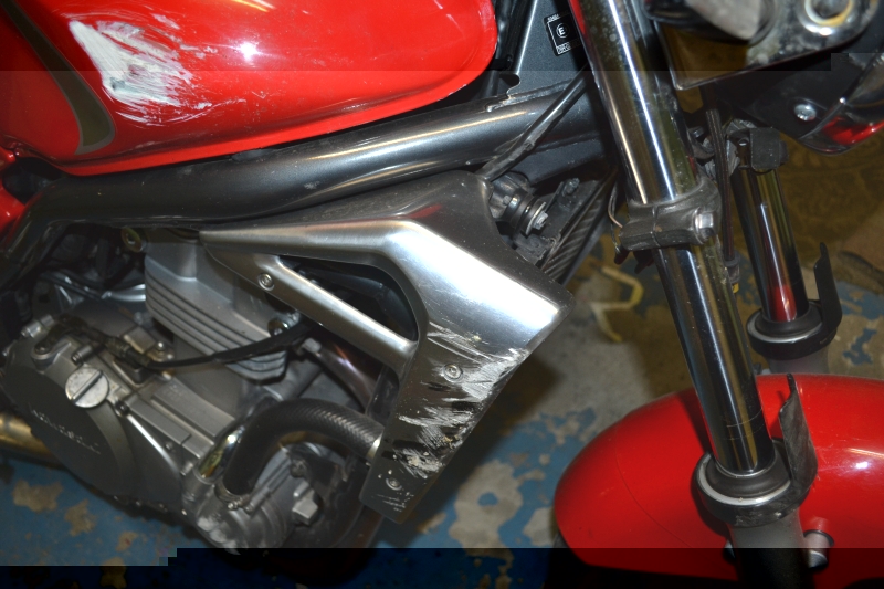 raguel pisze:Skutek porysowany bak, zniszczone zegary, pokrywa pompy wody, zadupek, kierunkowskazy z prawej, z tłumika nic nie zostało, kierownica zgięta, klamki hamulca nie ma, nie palą się kontrolki, motocykl nie odpala (chyba przez rozwaloną elektronikę na kierownicy, bo silnik, rama i lagi są całe, nie kręci rozrusznikiem).