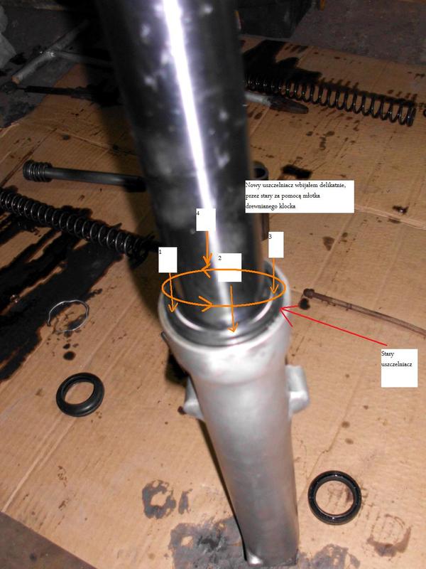 Z uwagi na to, że nie mam rurki o odpowiedniej średnicy i długości do wbijania użyłem młotka i kawałka drewnianego klocka wbijając uszczelniacz uderzając "na około", tak jak na szkicu: 15. Zdejmujemy stary uszczelniacz z nowego i zakładamy druciany pierścień zabezpieczający (jeżeli nie wchodzi w rowek, to oznacza, że uszczelniacz jeszcze nie jest na właściwym miejscu - jest za słabo wbity) oraz uszczelniacz przeciwkurzowy.